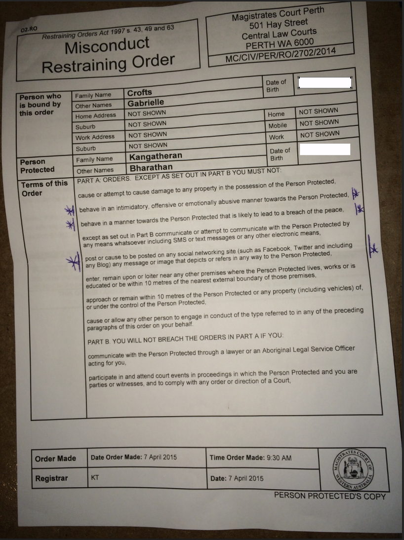 Screen Shot 2015-04-16 at 2.57.15 PM April 16, 2015Full resolution (818 × 1094) ← Previous Next → Misconduct Restraining Order 2702/14 Protecting myself against Gabrielle Therese Crofts Misconduct Restraining Order 2702/14 Protecting myself against Gabrielle Therese Crofts Share this:TweetEmailPocketShare on TumblrRedditPrintWhatsAppTelegram
